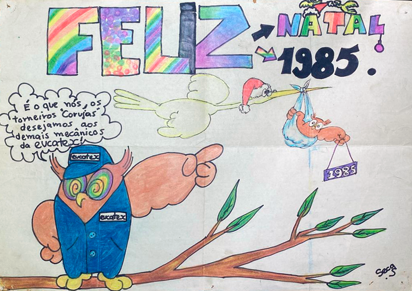 Os corujas eram os mecânicos de manutenção do turno da noite na unidade de Salto da Eucatex, supervisionados pelo meu pai e grande incentivador artístico durante as décadas de 1980 e 1990. Todo final de ano ele me pedia para desenhar um cartão de boas festas.