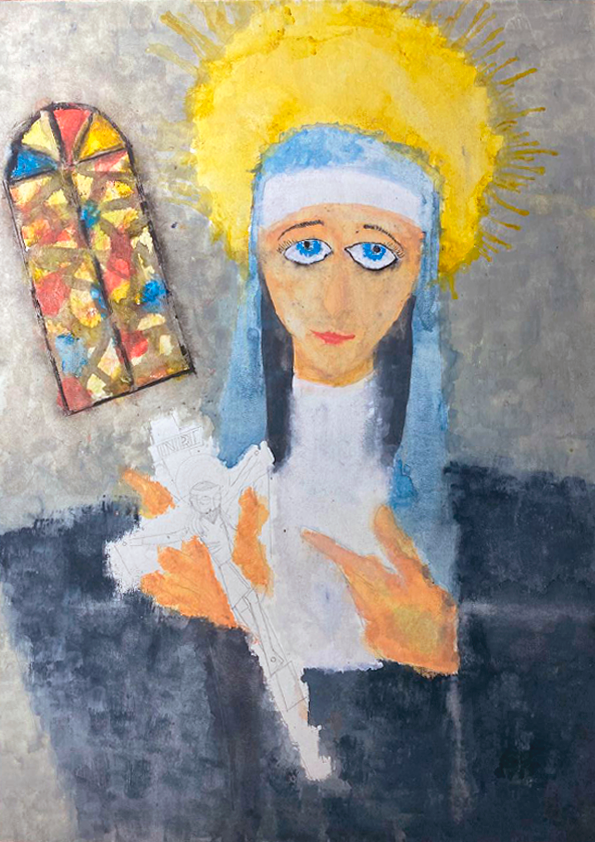Guache sobre canson representando Santa Rita, comissionado pelo padre da paróquia local. Mais um dos trabalhos abandonados sem terminar.